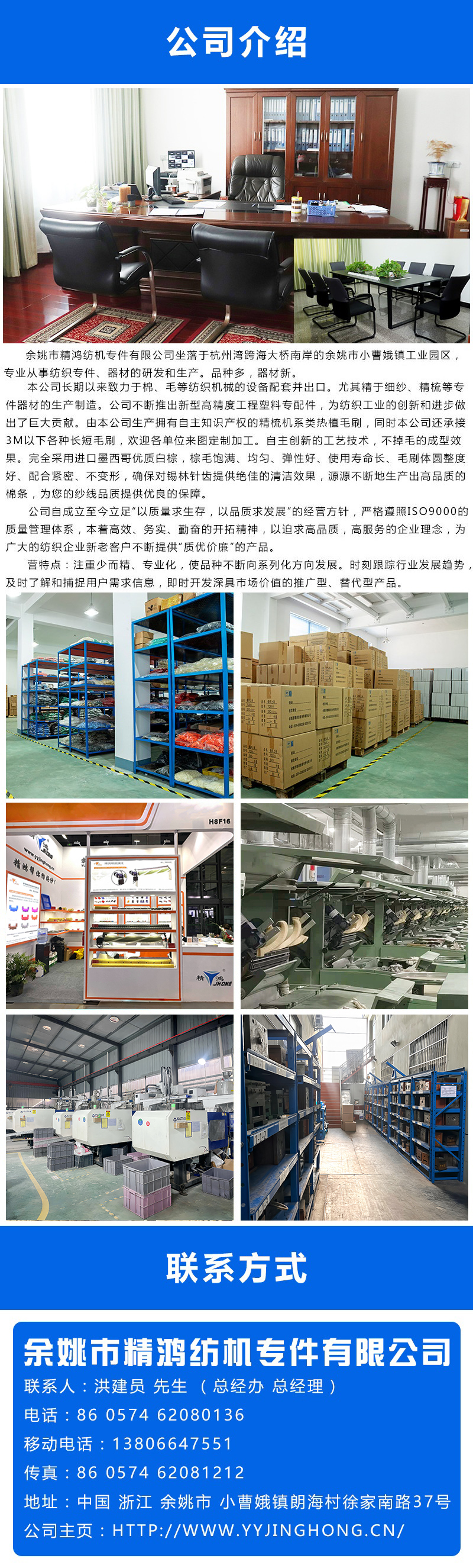 余姚市精鴻紡機(jī)專件有限公司位于浙江寧波,擁有25年以上的設(shè)計開發(fā)經(jīng)驗,專業(yè)生產(chǎn)紡織設(shè)備零件。本公司可根據(jù)客戶要求定制各種類型的刷子和塑料配件,是一家專業(yè)開發(fā)和生產(chǎn)各種新型紡織器材的企業(yè)。在創(chuàng)新、質(zhì)量、品種規(guī)格、產(chǎn)量及市場覆蓋率等方面均取得國內(nèi)同行業(yè)的領(lǐng)先地位